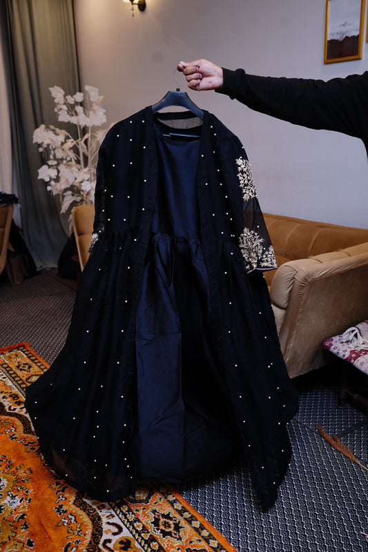 This three-piece outfit features a flowy chiffon shrug with intricate pearl embellishments and delicate embroidered...