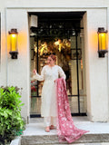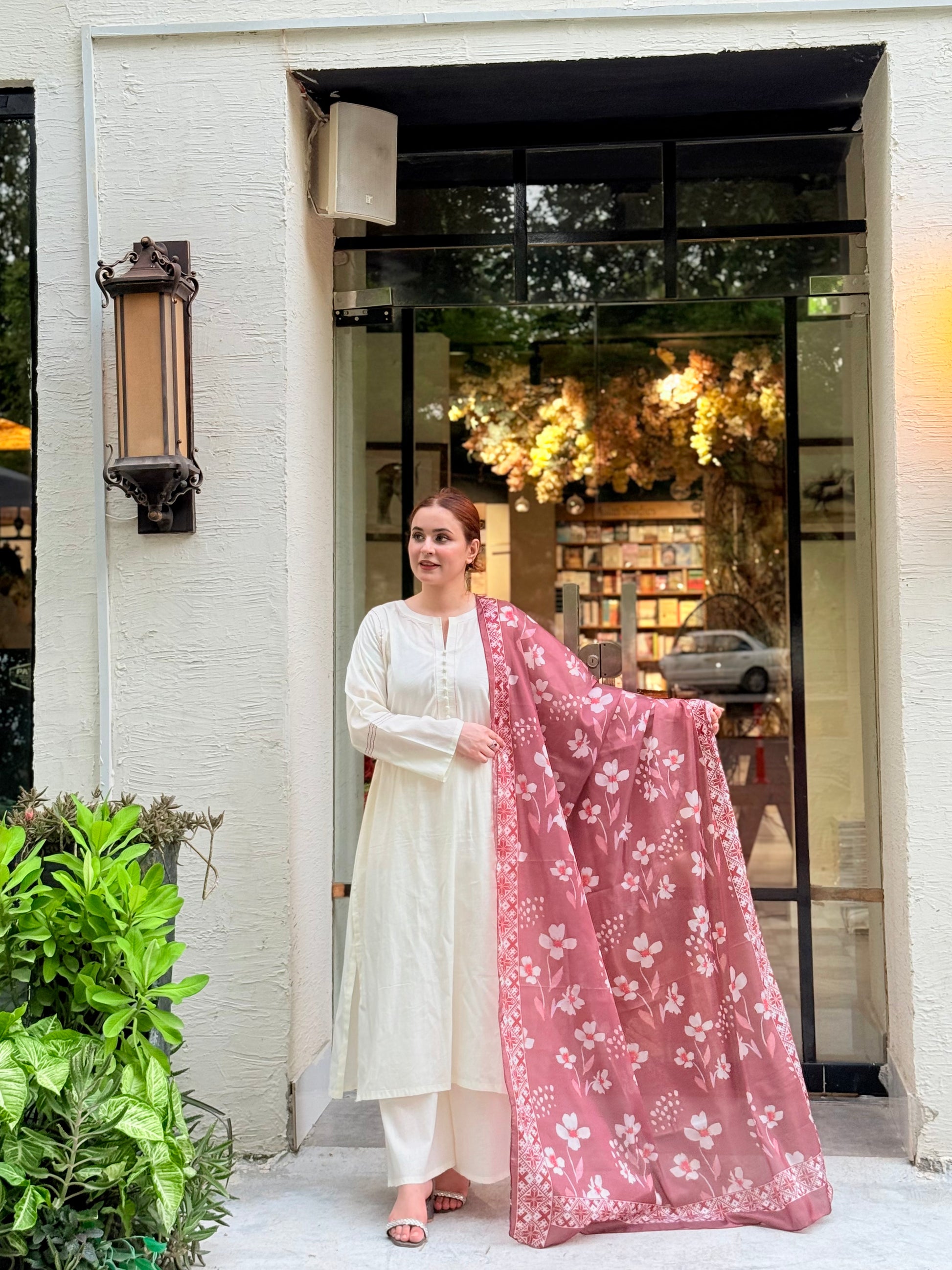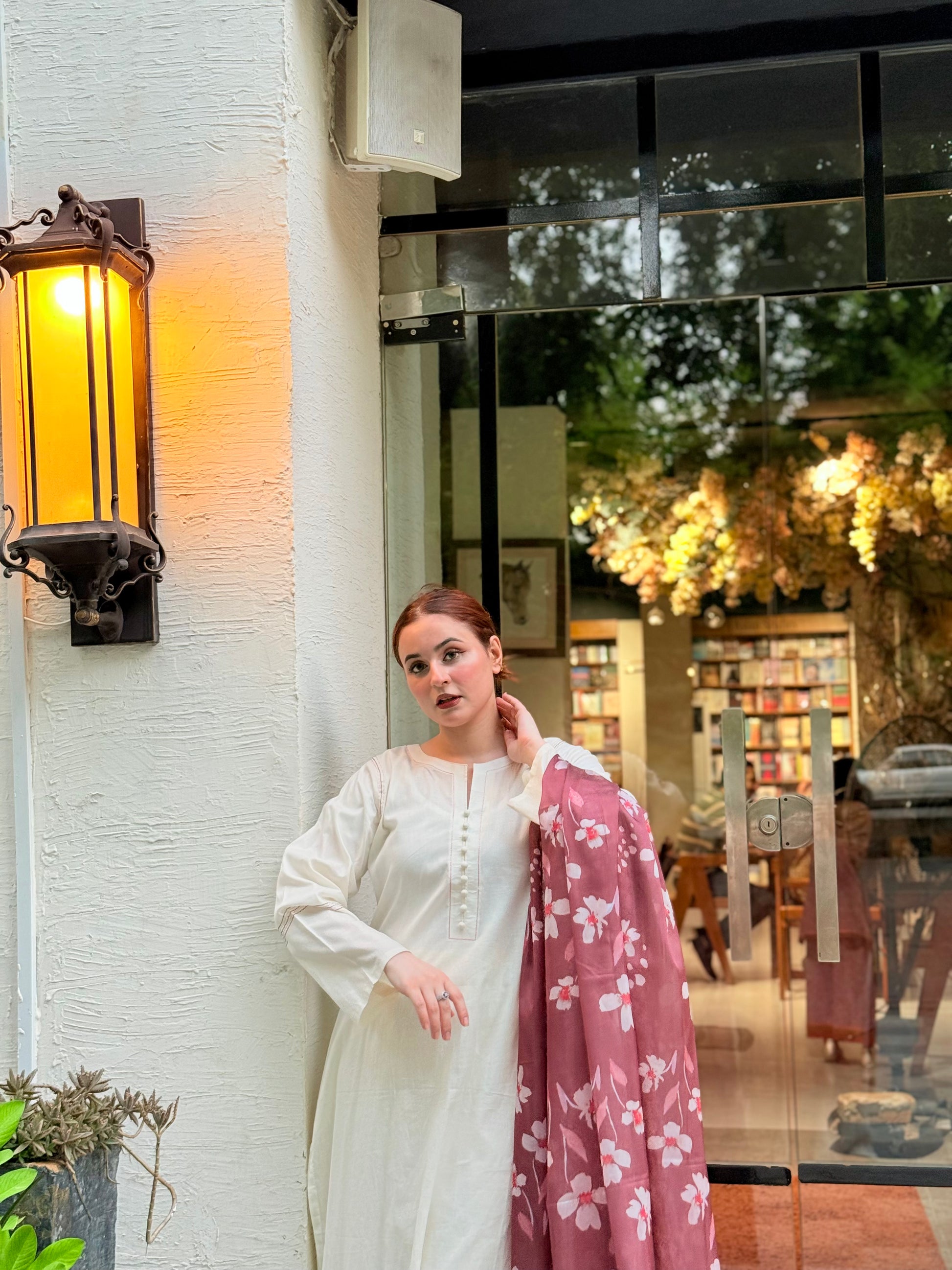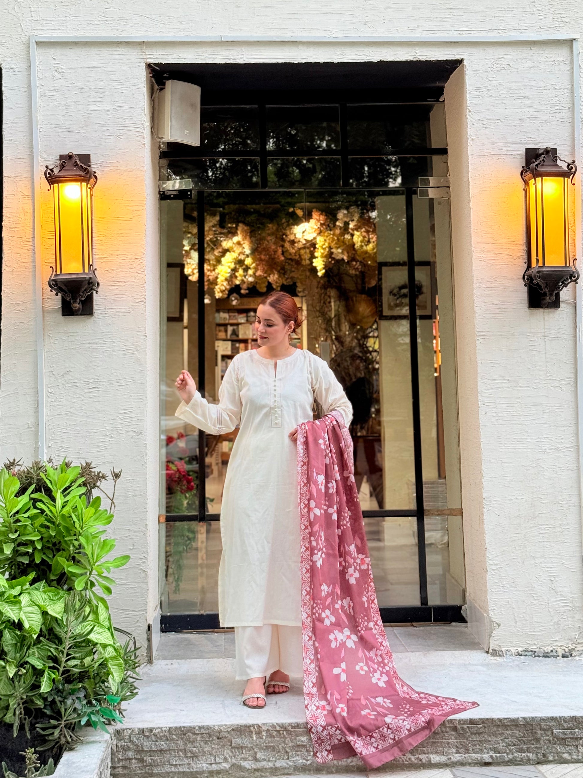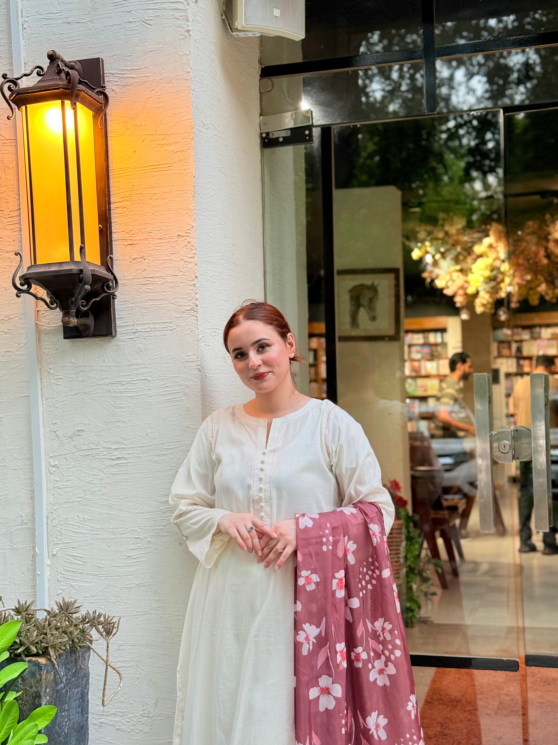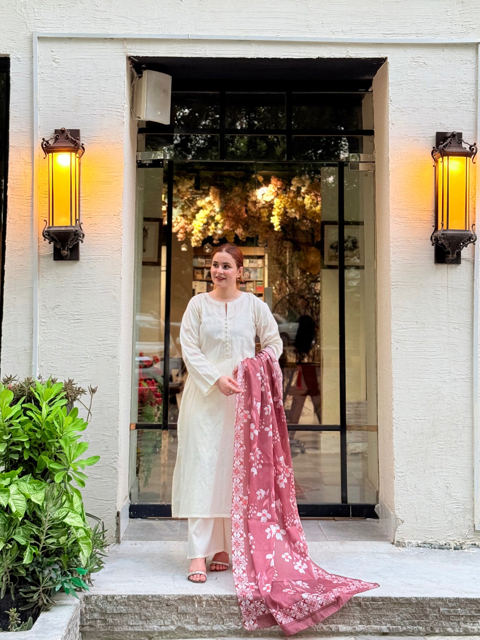 Experience elegance with this premium Cream Color A-line long shirt with Beautiful contrast Thread work on Neck and Sleeves, styled with wide bottoms for a graceful silhouette. The luxurious silk dupatta, adorned with delicate floral prints, adds a touch of timeless charm. Crafted with finest quality lawn, it ensures unmatched comfort and durability. A perfect blend of sophistication and style, designed for the modern woman. Make it yours and stand out effortlessly.