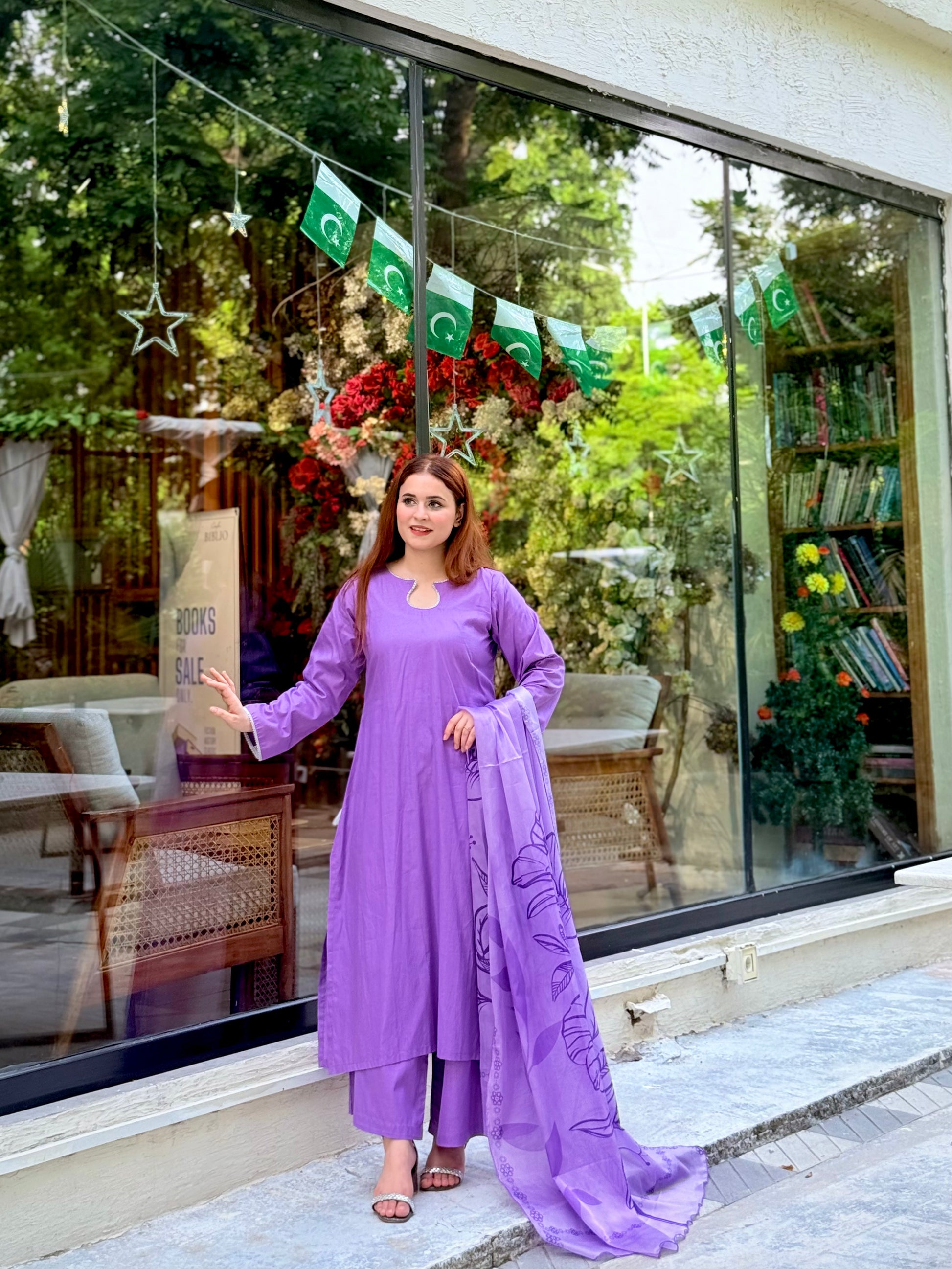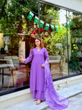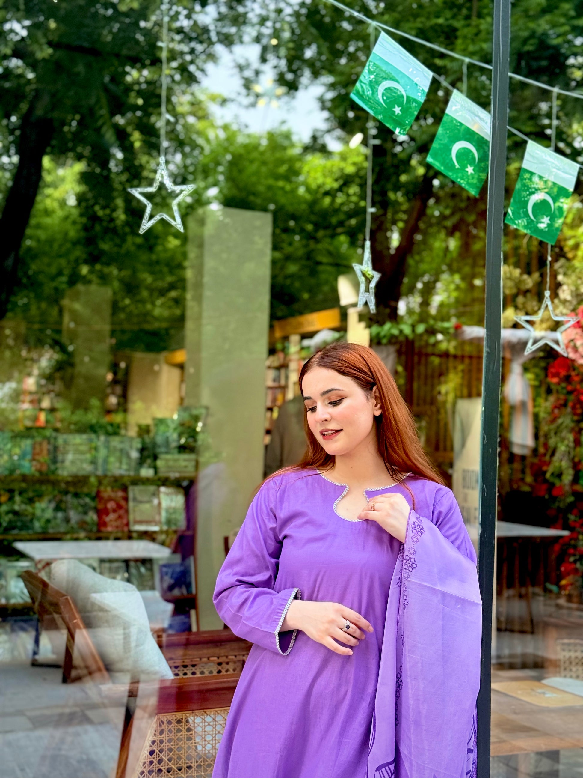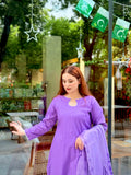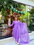 A gentle lilac A-line lawn shirt flows with a wide bottom, radiating grace and poise. The printed silk dupatta drapes with subtle luxury, completing the look with dreamy sophistication.