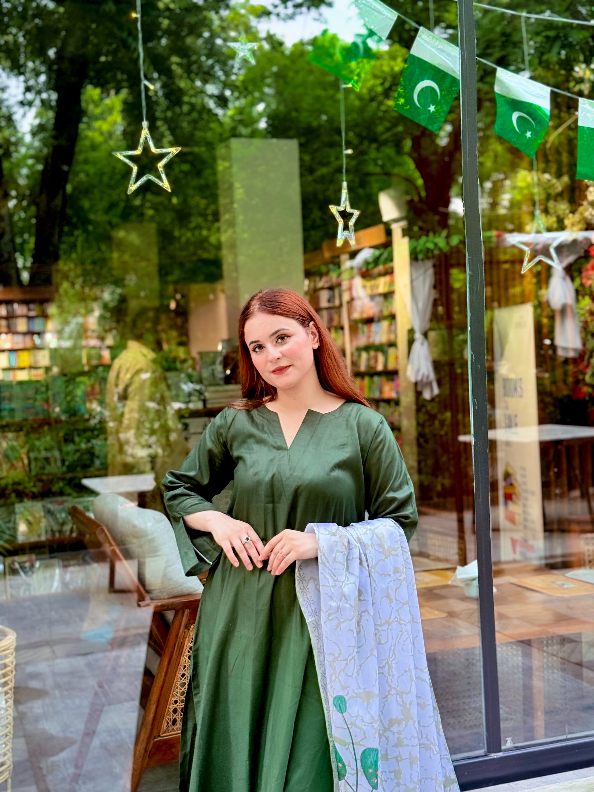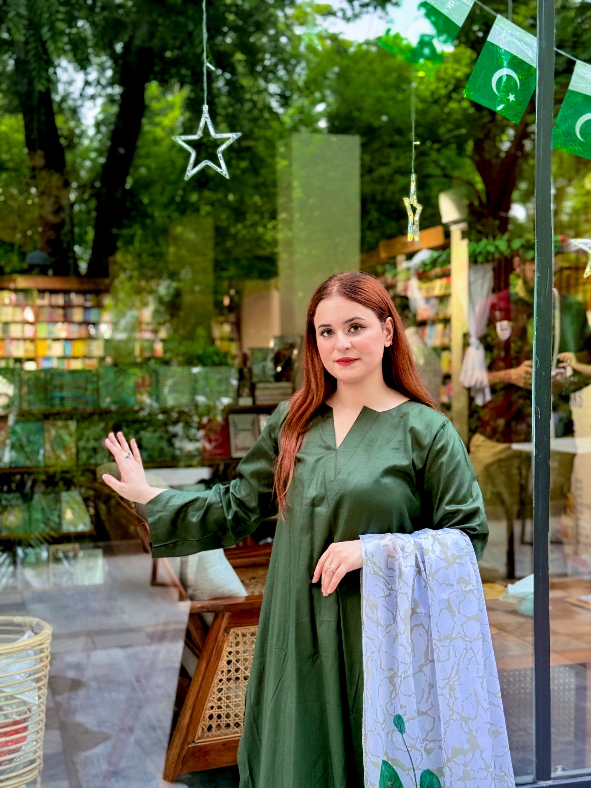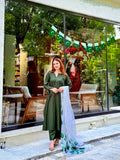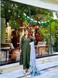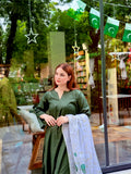 A bottle green A-line Lawn shirt, flowing with timeless grace.