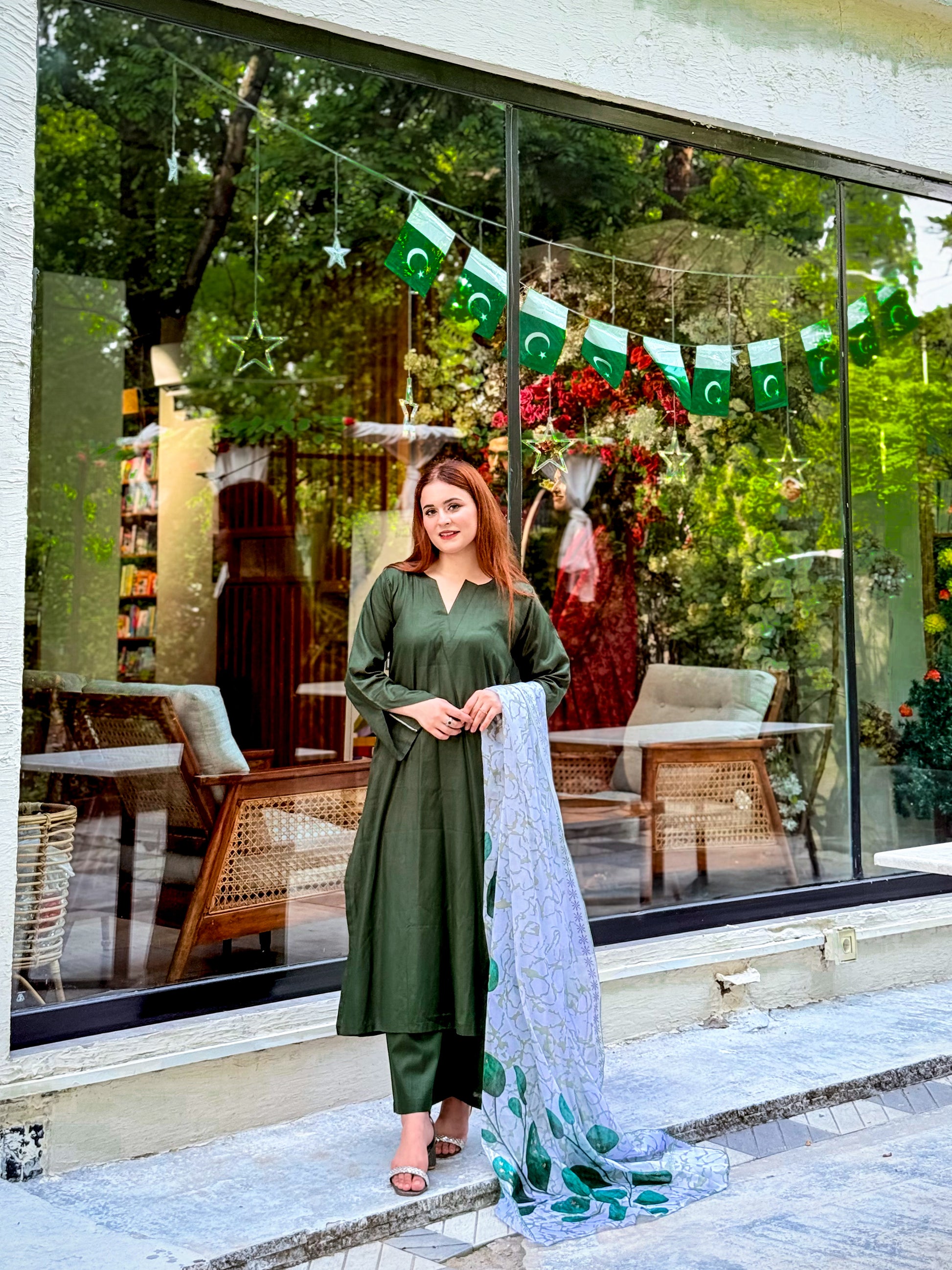 Paired with a soft white dupatta kissed with green prints.