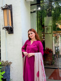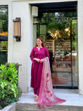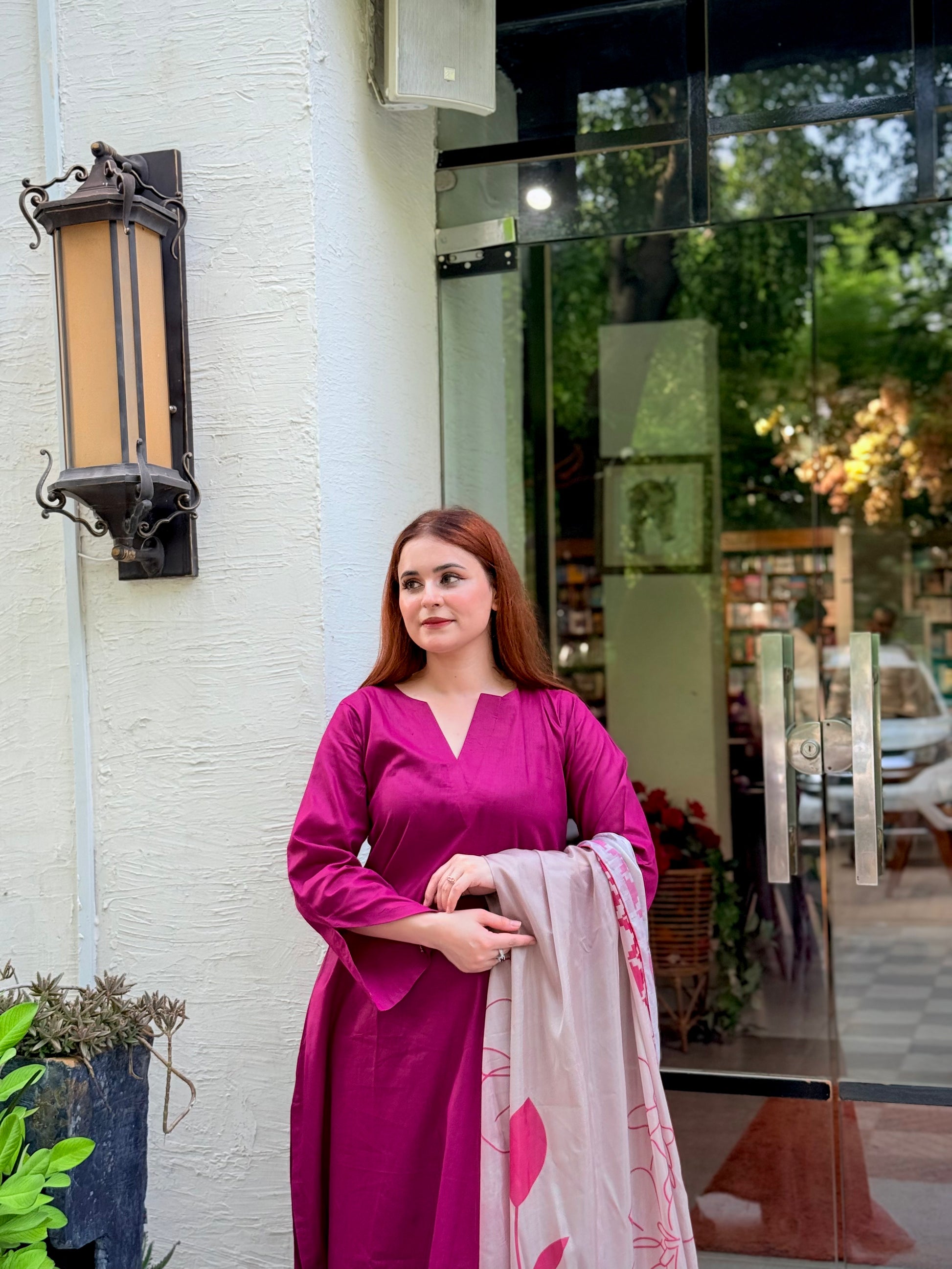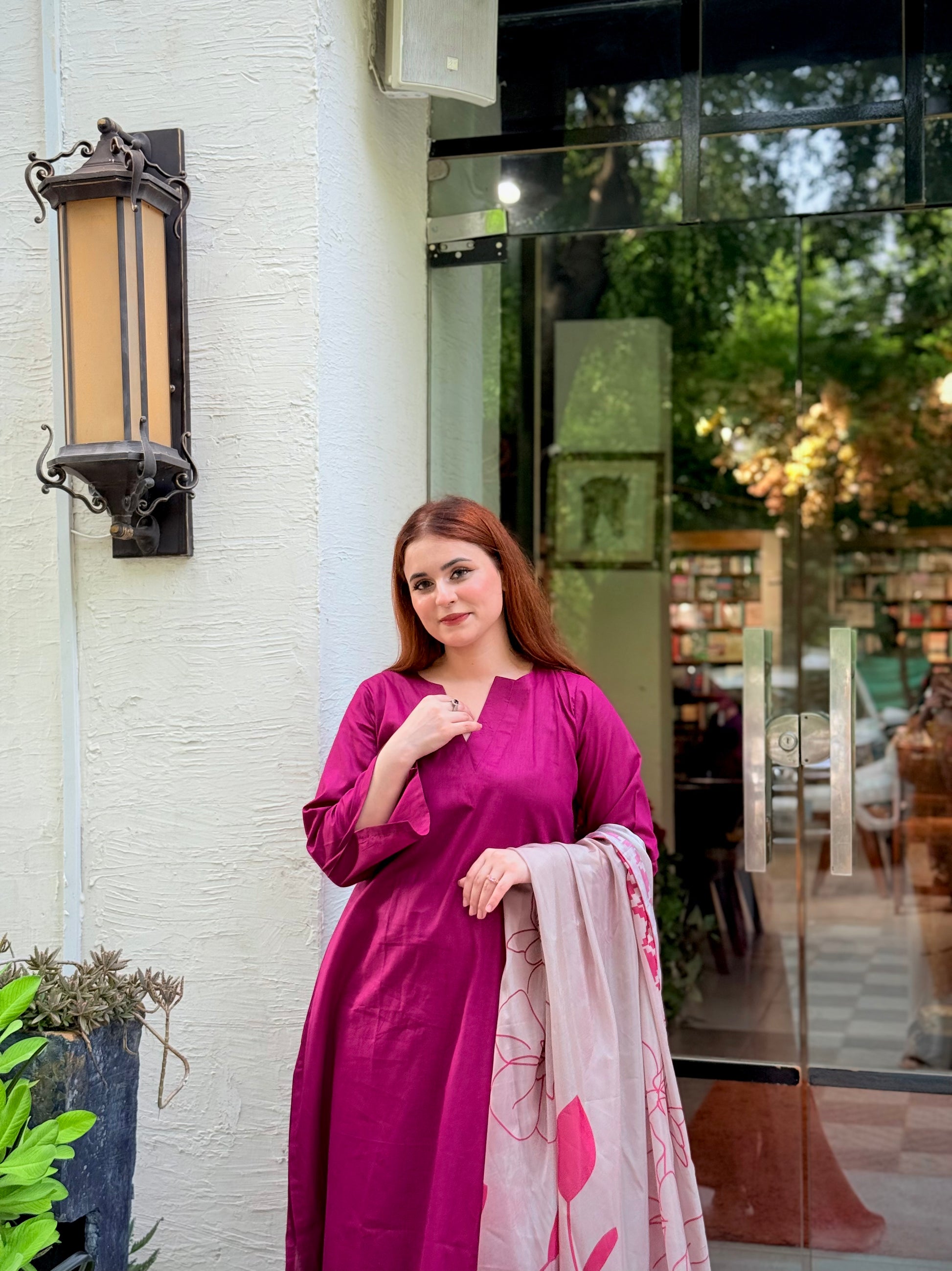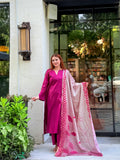 Step into a world of romance and elegance with this exquisite Fuchsia A-line lawn shirt, paired with wide-leg trousers for a graceful silhouette. The soft, flowing lawn fabric drapes beautifully, while the skin-toned silk dupatta, adorned with delicate fuchsia prints and refined borders, adds a touch of sophistication and allure. Perfect for turning heads at gatherings, this ensemble radiates confidence, charm, and timeless luxury.
