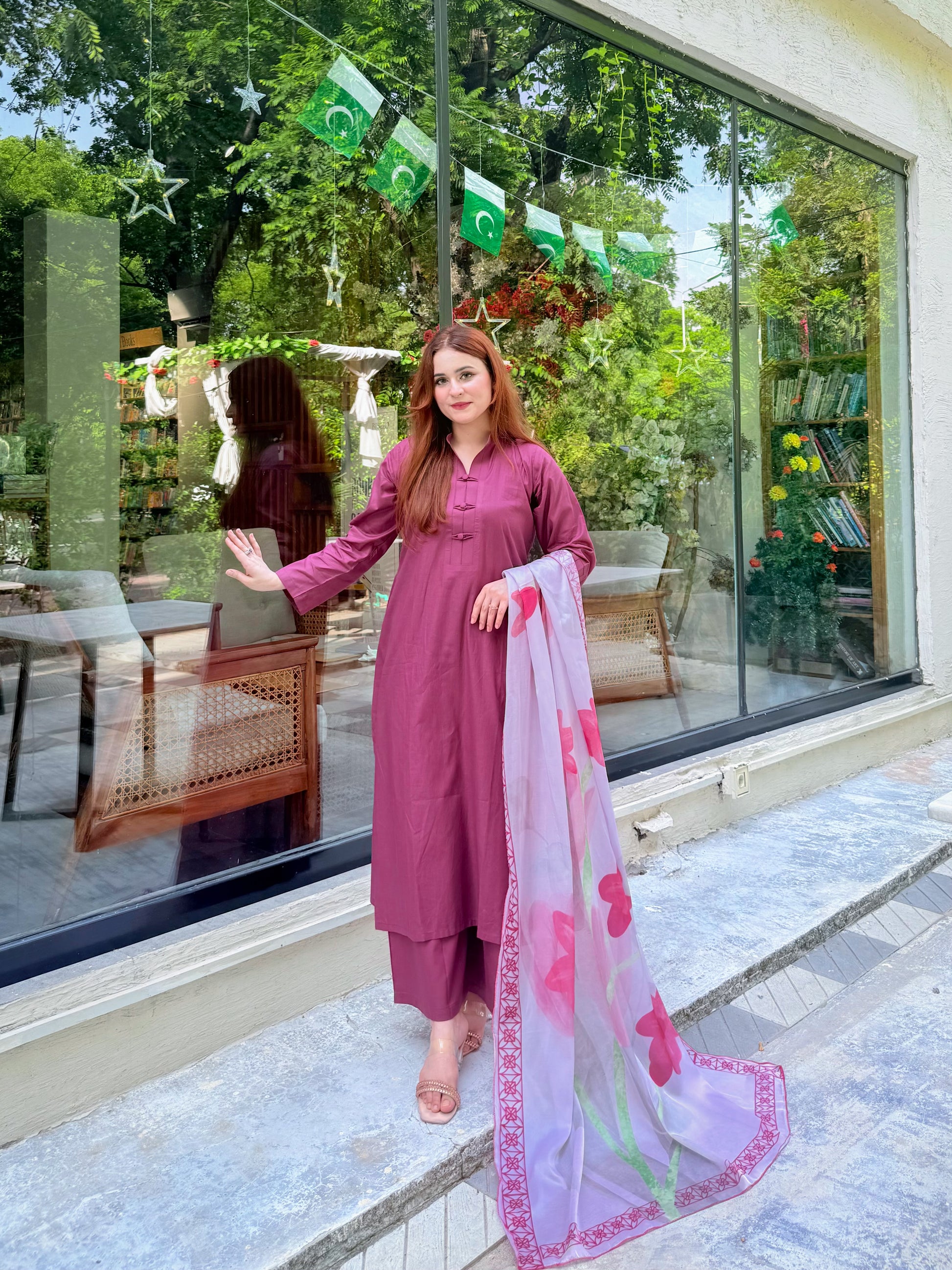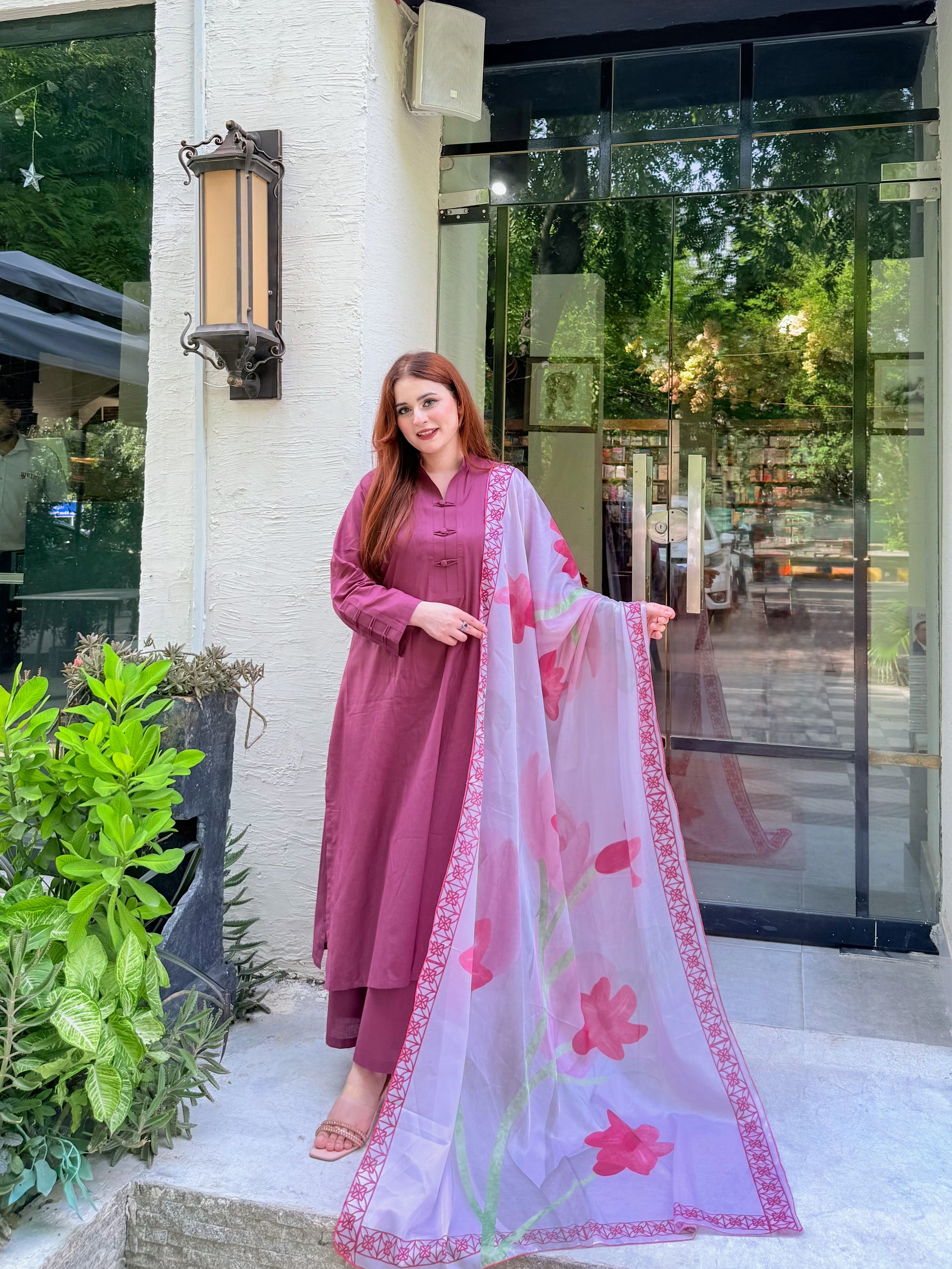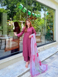 Drape yourself in the embrace of timeless beauty with this Rose-Pink A-line lawn shirt, paired with flowing wide-leg trousers that move as gracefully as you do. The white silk dupatta, adorned with lavish rose motifs and delicate borders, tells a story of elegance, romance, and quiet confidence. Perfect for moments where you wish to be remembered, this ensemble awakens your inner charm and sophistication, letting you step into every gathering with poise, allure, and the feeling of being truly cherished.