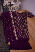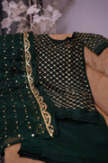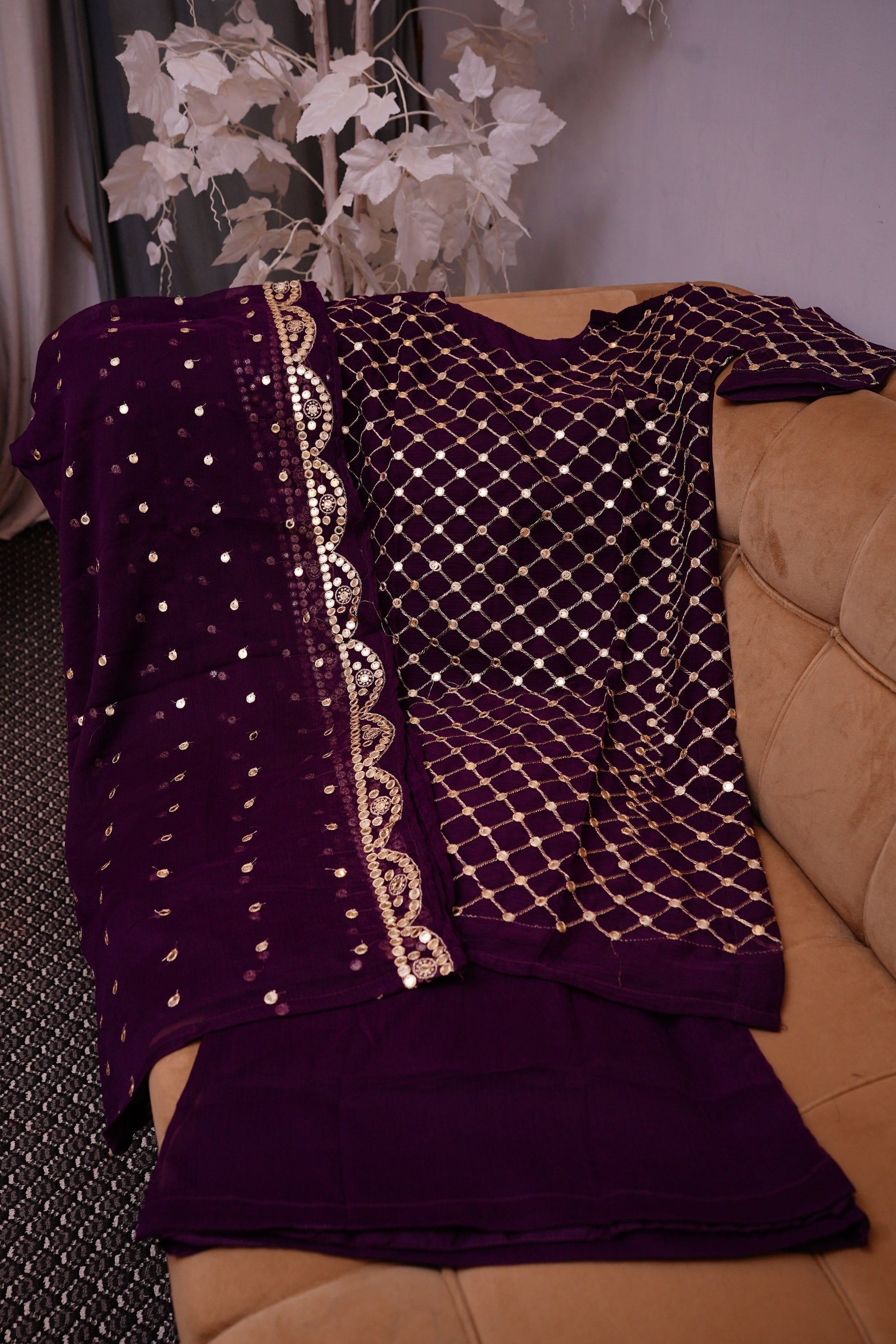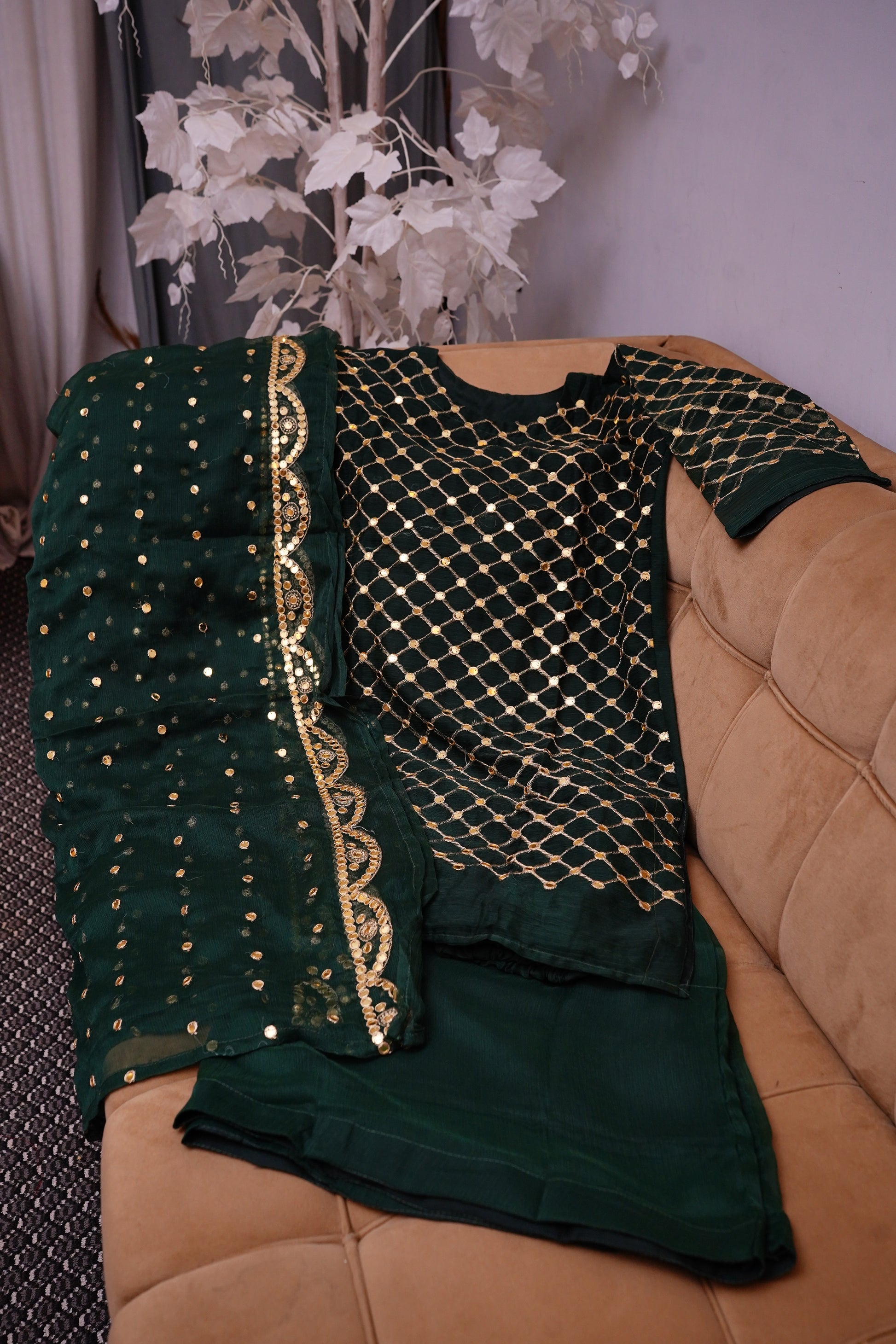 Sitara-e-Kiran is ensemble crafted from chiffon, embodying elegance and sophistication. The shirt features intricate golden mirror work arranged in a delicate geometric pattern, adding a regal charm. The dupatta is adorned with scattered embellishments and a beautifully detailed border, enhancing the overall appeal. Paired with a matching Palazzo, this outfit is a perfect choice for festive gatherings, wedding celebrations, and formal events. Its lightweight chiffon fabric ensures comfort while exuding grace and grandeur.